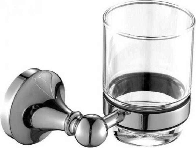 Стакан для зубных щеток Aquanet 5584 из прозрачного стекла комплектуется держателем, представляющим собой широкое кольцо, которое крепится к симпатичному элементу, напоминающему положенную на бок шахматную пешку. В хромированном исполнении она выглядит особенно изысканно. Такая элегантная вещь будет хороша в интерьере, оформленном в любом стиле, и ее хромированная часть будет аккомпанировать по цвету и стилю со смесителем.