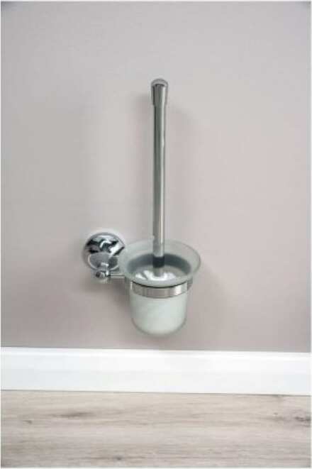 Ершик для унитаза Aquanet 5588 с чистящей частью из жесткой полиэтиленовой щетины и удобной ручкой средней длины, имеющей вверху небольшое каплевидное утолщение, устанавливается в аккуратный стаканчик из матового стекла, больше напоминающий небольшую вазочку с загнутыми краями. Крепление для кольца-держателя стакана располагается под углом к стене, что позволяет разместить его в помещении с максимальной экономией свободного места. Крепление само по себе является декоративным элементом с обтекаемыми формами и эффектными деталями.