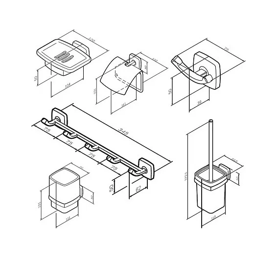 - бумагодержатель, крючок, полотенцедержатель, стакан, мыльница