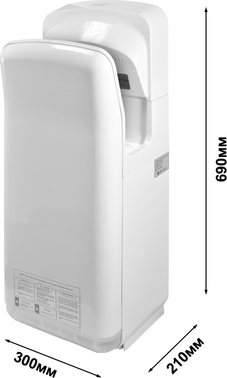 Электрическая сушилка для рук Puff-8878UF с UF, относится к классу высокоскоростных электросушилок. Осушение рук осуществляется за счет двух узконаправленных быстрых потоков воздуха, которые фактически сдувают воду. Скорость воздуха может достигать 95 м.сек. При использовании такого типа электрополотенца, сушка рук занимает от 5 до 7 секунд. Данная модель рукосушителя снабжена переключателем холодный-горячий, что дает возможность использовать холодный воздух (при мощности устройства 900 Вт.) или горячий воздух (при мощности устройства в 2000 Вт.). Влага с рук собирается в каплесборнике объемом 0.5 л., который периодически необходимо опустошать (это не требует специальных навыков). Материал сушилки Puff-8878UF термостойкий пластик, толщиной 3 мм.