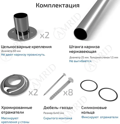 - Карниз - 1 шт. Цельносварные крепления - 2 шт. Отражатели - 2 шт. Дюбель-гвозди - 8 шт. Силиконовые кольца - 2 шт.
