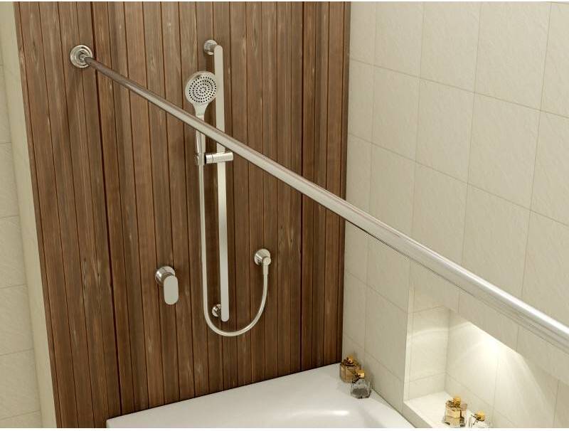 Карниз выполнен из нержавеющей полированной стали. Диаметр трубы 25 мм, толщина стенки 1 мм. Удобный и надежный крепеж к стене из нержавеющей стали. Строгое повторение конфигурации ванн. Порядок установки карниза в ванной: 1. Собрать карниз и приставить к стенам. Найти нужное положение и наметить отверстия для дюбелей. 2. Просверлить отверстия, вставить дюбели. 3. Крепление снять с карниза и закрепить на стене с помощью шурупов-саморезов. 4. Закрепить на стене второе крепление вместе с карнизом и установленными на нём декоративными отражателями. 5. Зафиксировать положение карниза стопорными винтами. 6. Придвинуть декоративные отражатели вплотную к стене для обеспечения должного внешнего вида