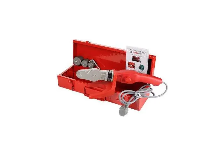 - Металлический кейс. Сварочный аппарат мощностью 750 Вт. Опора для сварочного аппарата. Сварочные насадки диаметром 20, 25 и 32 мм.