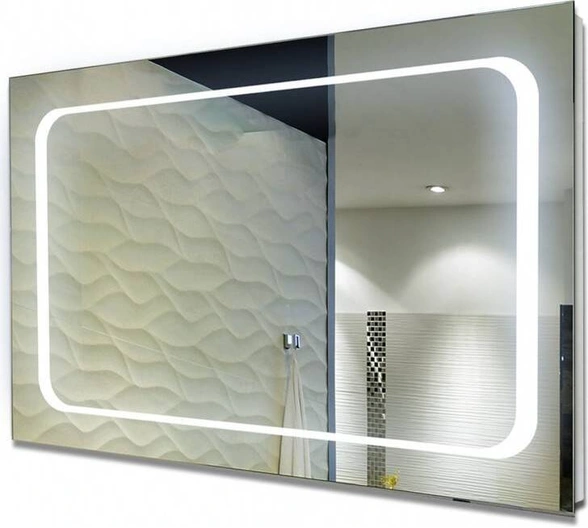 Прямоугольное зеркало со светящимся рисунком. Ширина рисунка 25 мм. Светодиодная подсветка зеркала выполнена по специальной технологии, которая обеспечивает равномерное свечение светового рисунка при толщине конструкции 3 см.