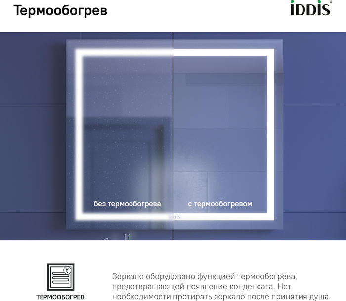 Зеркало IDDIS® оборудовано функцией термообогрева, предотвращающей появление конденсата. Это избавит от необходимости протирать зеркало после принятия душа.