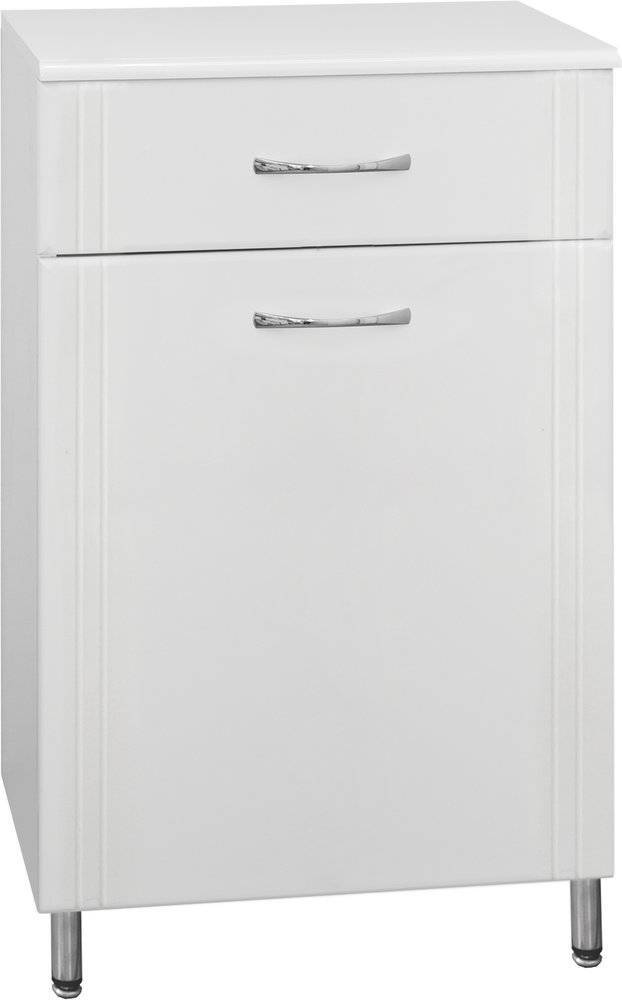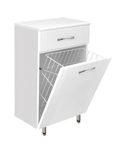 Белоснежная тумба Эко Стандарт ТН 60 представлена отечественным производителем Style Line. Корпус изготовлен из ламинированной ДСП, фасад – из МДФ с глянцевым покрытием. Дополнительную эстетику придают хромированные ручки. Особенностью модели является наличие бельевой корзины за удобной откидной дверцей. Вентилируемые отверстия защитят вещи от сырости и появления неприятного запаха. Вместительный ящик обеспечит максимальный доступ к содержимому благодаря направляющим полного выдвижения Hettich. Изделие предусматривает напольный монтаж на устойчивые нескользящие ножки.