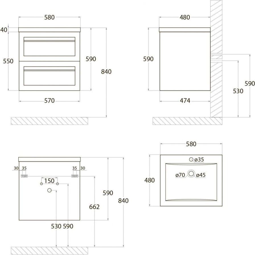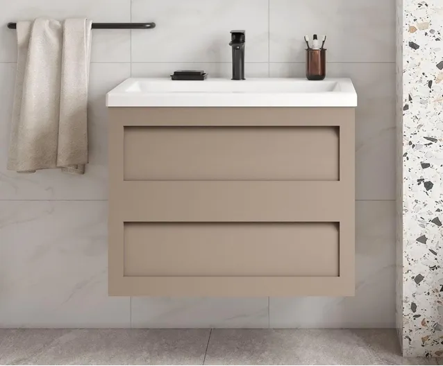 Мебель для ванной комнаты с двумя выдвижными ящиками, комплектуется раковиной из искусственного мрамора . База оснащена доводчиками скрытого монтажа с системой Soft close (плавного закрывания)