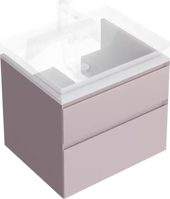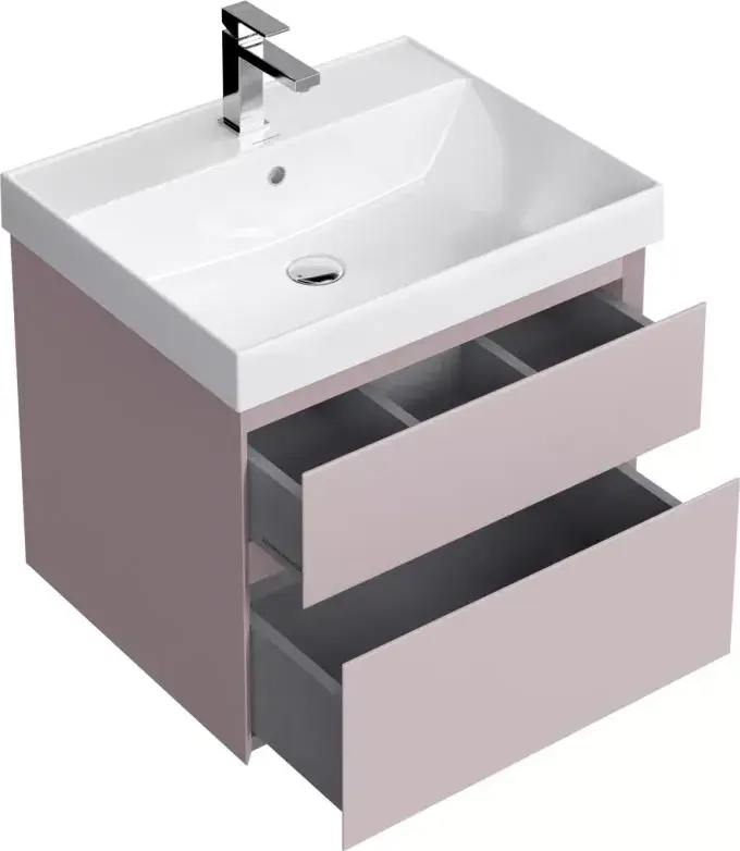 Подвесная тумба в цвете мальва (розовая) матовая с двумя выдвижными ящиками. Ящики закрываются плавно и бесшумно. Внутренняя отделка ящиков напоминает фактуру ткани. Сочетается с раковиной Cubo/Кубо шириной 60 см.