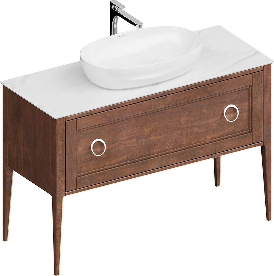 Напольная тумба с одним выдвижным и одним внутренним ящиками выполнена из массива ольхи с отделкой «закрытая пора». Вместительный ящик с плавным закрыванием украшен двумя крупными ручками. Сочетается с керамическими столешницами PLAZA Classic шириной 120 см. Подходит для установки раковин с типом монтажа «накладная на столешницу» и «встраиваемая сверху».