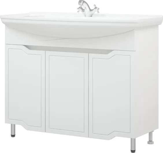 | У тумбы «Мирра» 3 распашные дверки, позади дверок – полки. Фасады без ручек – вместо них, эргономичная форма - для удобства открывания. Фасад выполнен из влагостойкой плиты МДФ. В комплект входят хромированные опоры. |
