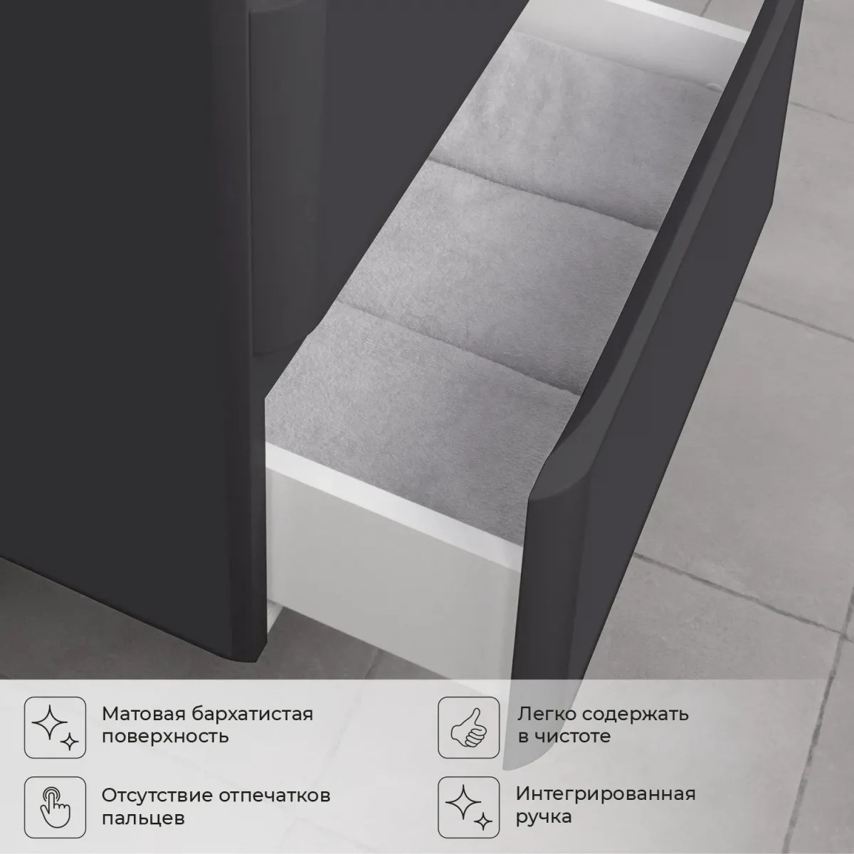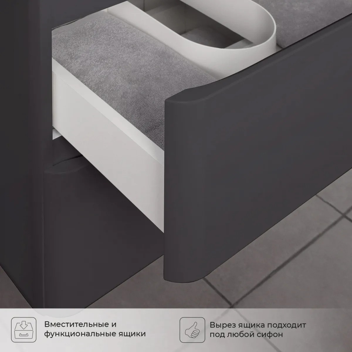 Невероятно органичная по дизайну коллекция Roberto великолепно смотрится в цвете графит. Эстетика изящества и минимализма - скругленные фасады, фрезерованные ручки. Подвесная тумба со столешницей в ванную комнату покрыта графитовой пленкой-ПВХ. Качественная фурнитура с доводчиками обеспечивает легкое открывание и плавное закрывание ящиков. Вырез под сифон универсальный, для любого типа. Благодаря своей конструкции тумба обеспечивает удобный доступ к раковине и позволяет скрыть коммуникации. Подвесной способ установки дает возможность не только визуально увеличить пространство, но и обеспечивает быстрый и удобный доступ для уборки. Тумба со столешницей в ванную оснащена удобными ящиками для хранения, что позволяет разместить всё необходимое под рукой. Изысканность, простота и гармоничность - все сошлось в этой прекрасной коллекции! Для точного выбора тумбочки со столешницей в ванную комнату рекомендуем обратиться к схеме замеров, которая находится в карточке товара, размеры изделия могут отличаться +/-1 см в связи со спецификой производства. Дополнить комплект вы можете настольной раковиной Ceramica Nova Element и изделиями из коллекции Roberto.