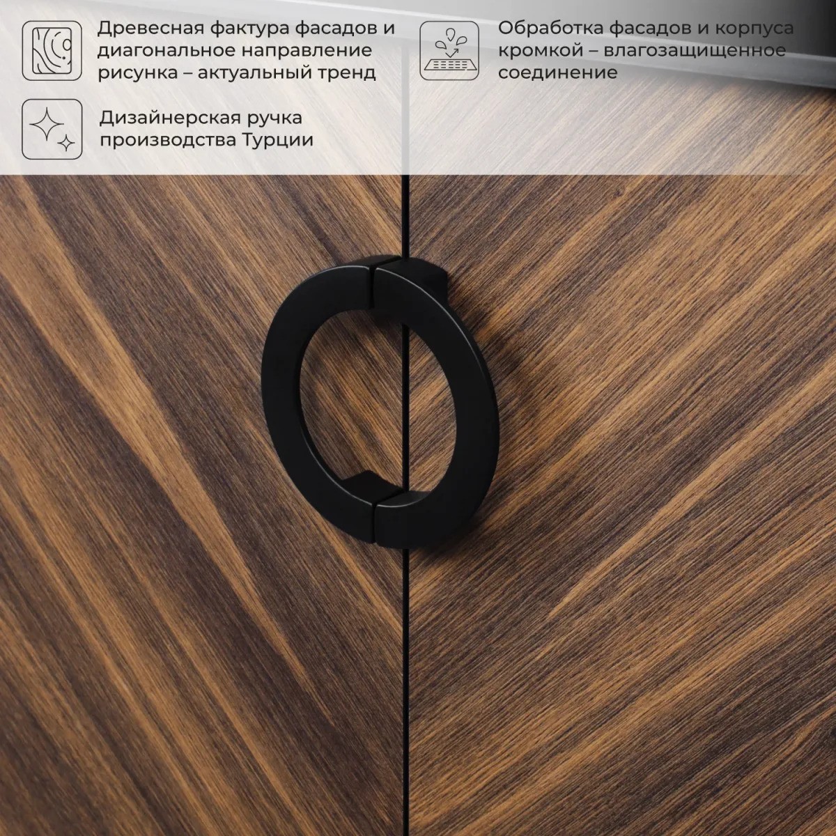 Коллекция Palladio - великолепное звучание современной классики. Изящные пропорции и нестандартный подход к дизайну с сохранением функциональности. Тумба для ванной выполнена в модных деревянных декорах. Технология производства позволила сделать элементы мебели устойчивыми к влаге. Качественная фурнитура с доводчиками обеспечивает легкое открывание и плавное закрывание дверей. Дизайнерские металлические ручки с покрытием - не только декоративный элемент, но и удобное решение - фасады остаются чистыми при постоянном открывании и закрывании.