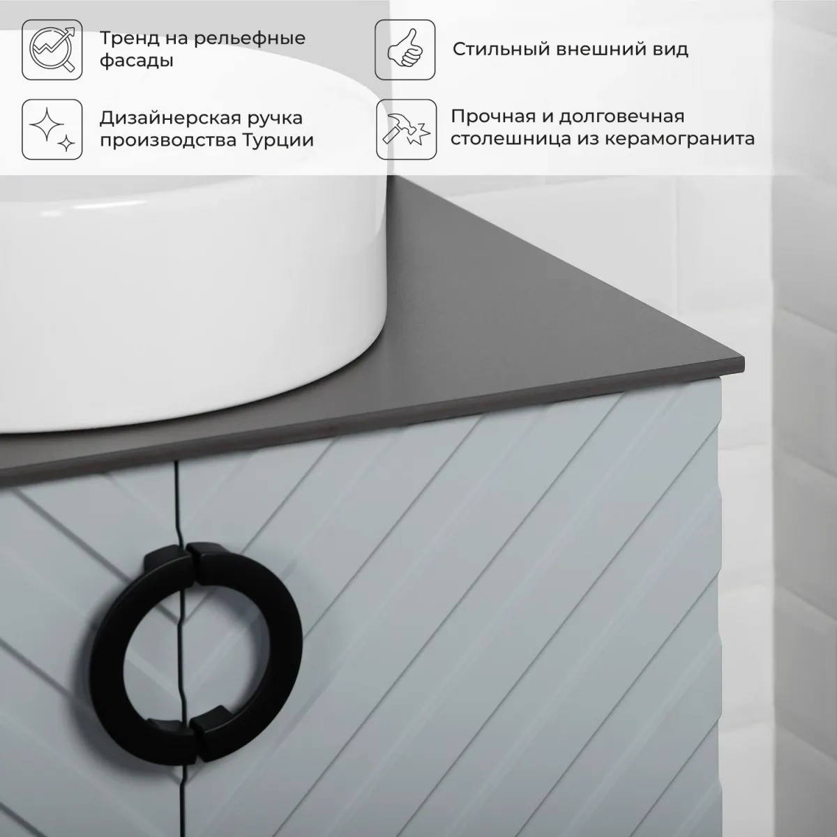 Коллекция Palladio - великолепное звучание современной классики. Изящные пропорции и нестандартный подход к дизайну с сохранением функциональности. Тумба со столешницей выполнена в модных декорах. Технология производства позволила сделать элементы мебели устойчивыми к влаге. Качественная фурнитура с доводчиками обеспечивает легкое открывание и плавное закрывание дверей. Дизайнерские металлические ручки с покрытием - не только декоративный элемент, но и удобное решение - фасады остаются чистыми при постоянном открывании и закрывании. Вырез под сифон универсальный, для любого типа. Благодаря своей конструкции тумба обеспечивает удобный доступ к раковине и позволяет скрыть коммуникации. Тумба со столешницей в ванную оснащена удобным шкафчиком для хранения, что позволяет разместить всё необходимое под рукой. Для точного выбора тумбочки со столешницей в ванную комнату рекомендуем обратиться к схеме замеров, которая находится на фото в карточке товара, размеры изделия могут отличаться +/-1 см в связи со спецификой производства.