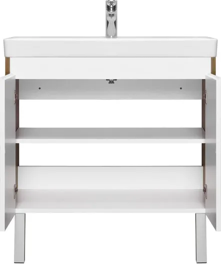 Тумба Сканди Doors 80 выполнена в популярном минималистичном скандинавском стиле. Корпус тумбы выполнен из влагостойкой ЛДСП в декоре натурального дерева, а фасады-створки в белой глянцевой покраске. За створками скрывается вместительное пространство, разделенное на две части регулируемой по высоте полкой из ВЛДСП. На тумбе нет выступающих деталей и фурнитуры, открытие створок реализуется за фасад, верхняя часть которого обработана под ручку L-профиль. К тумбе идеально подходит белоснежная раковина Адриана от бренда Santek. Раковина продается отдельно.