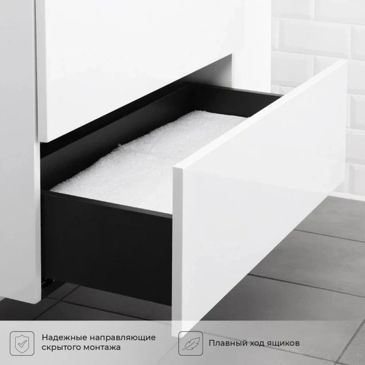 Белоснежная глянцевая мебель из коллекции Icon добавит ощущения чистоты и безупречности в современный интерьер ванной комнаты. Изделия выполнены из влагозащищенного МДФ, корпус и фасады покрыты высокоглянцевой ПВХ-пленкой. Система push-to-open позволяет открывать выдвижные ящики простым нажатием на фасад. Качественные направляющие скрытого монтажа обеспечат плавное открывание и закрывание ящичка. То есть, при небольшом надавливании, ящик — немного выдвинется наружу. Главное преимущество системы: отсутствие ручек на фасадах. Подвесной способ установки обеспечивает легкую уборку в ванной комнате. Идеальные прямые линии, вкладные фасады, тонкая рамка корпуса, лаконичность, которая восхищает. Такая мебель удовлетворит потребности покупателей в функциональности, но не будет забирать все внимание на себя.