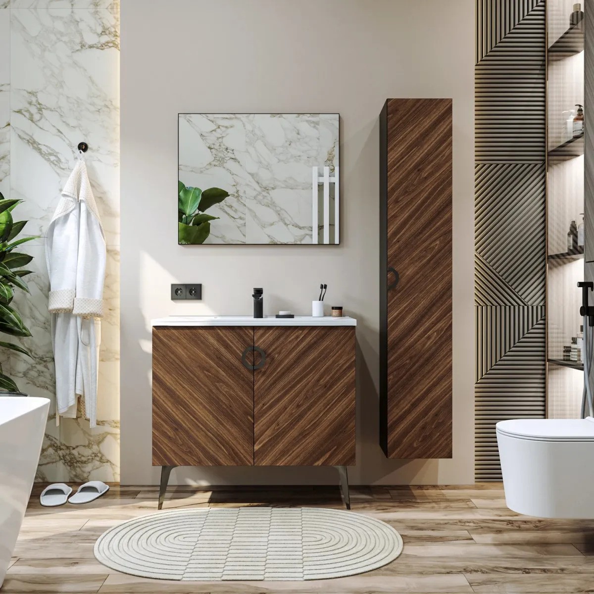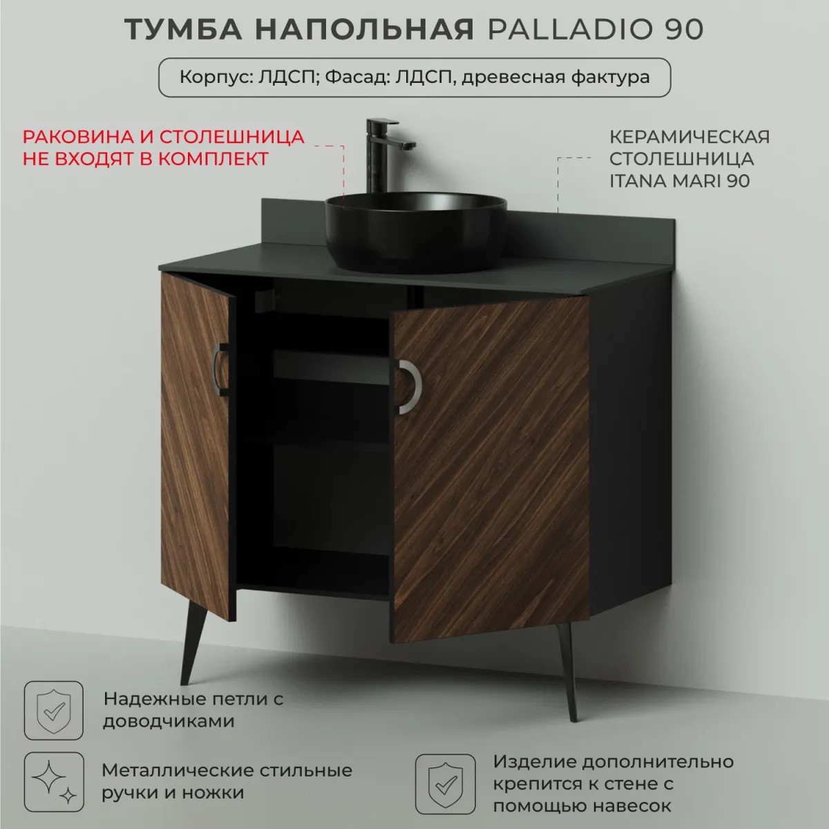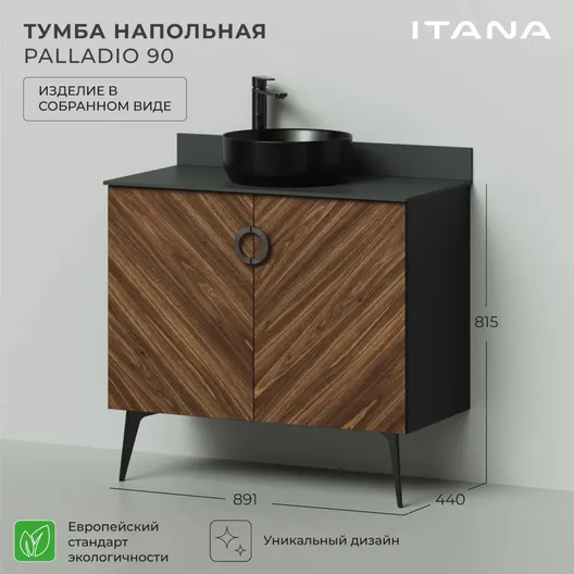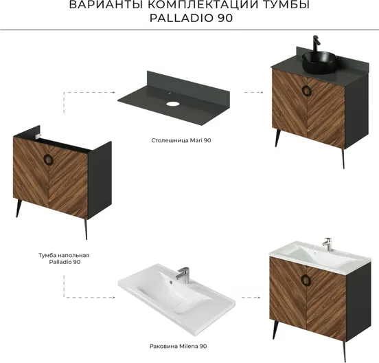 Коллекция Palladio - великолепное звучание современной классики. Изящные пропорции и нестандартный подход к дизайну с сохранением функциональности. Тумба для ванной выполнена в модных деревянных декорах. Технология производства позволила сделать элементы мебели устойчивыми к влаге. Качественная фурнитура с доводчиками обеспечивает легкое открывание и плавное закрывание дверей. Дизайнерские металлические ручки с покрытием - не только декоративный элемент, но и удобное решение - фасады остаются чистыми при постоянном открывании и закрывании.