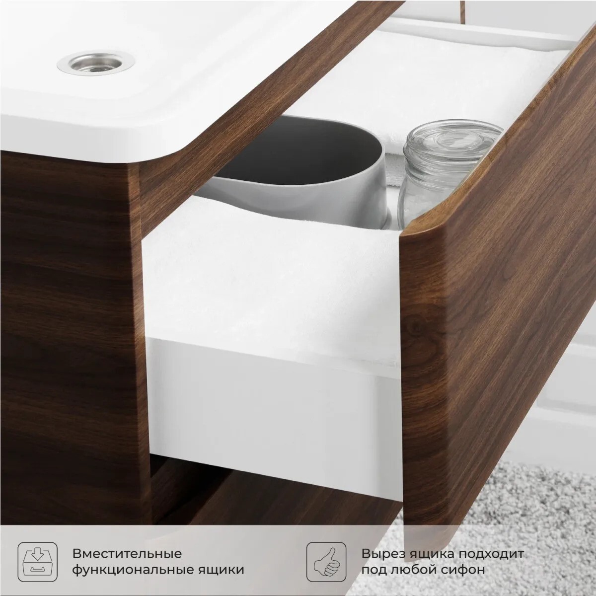 Невероятно органичная по дизайну коллекция Roberto великолепно смотрится в цвете Орех Пекан шоколад стронг. Качественная фурнитура с доводчиками. Плавное и бесшумное закрывание ящиков. Подвесной способ установки тумбы под раковину дает возможность не только визуально увеличить пространство, но и обеспечивает быстрый и удобный доступ для уборки. Тумба для ванной комнаты способна вместить в себя достаточно много вещей. Изысканность, простота и гармоничность - все сошлось в этой прекрасной коллекции! Модель совместима с раковиной Итана Adelina 60. После покупки требуется самостоятельная сборка.