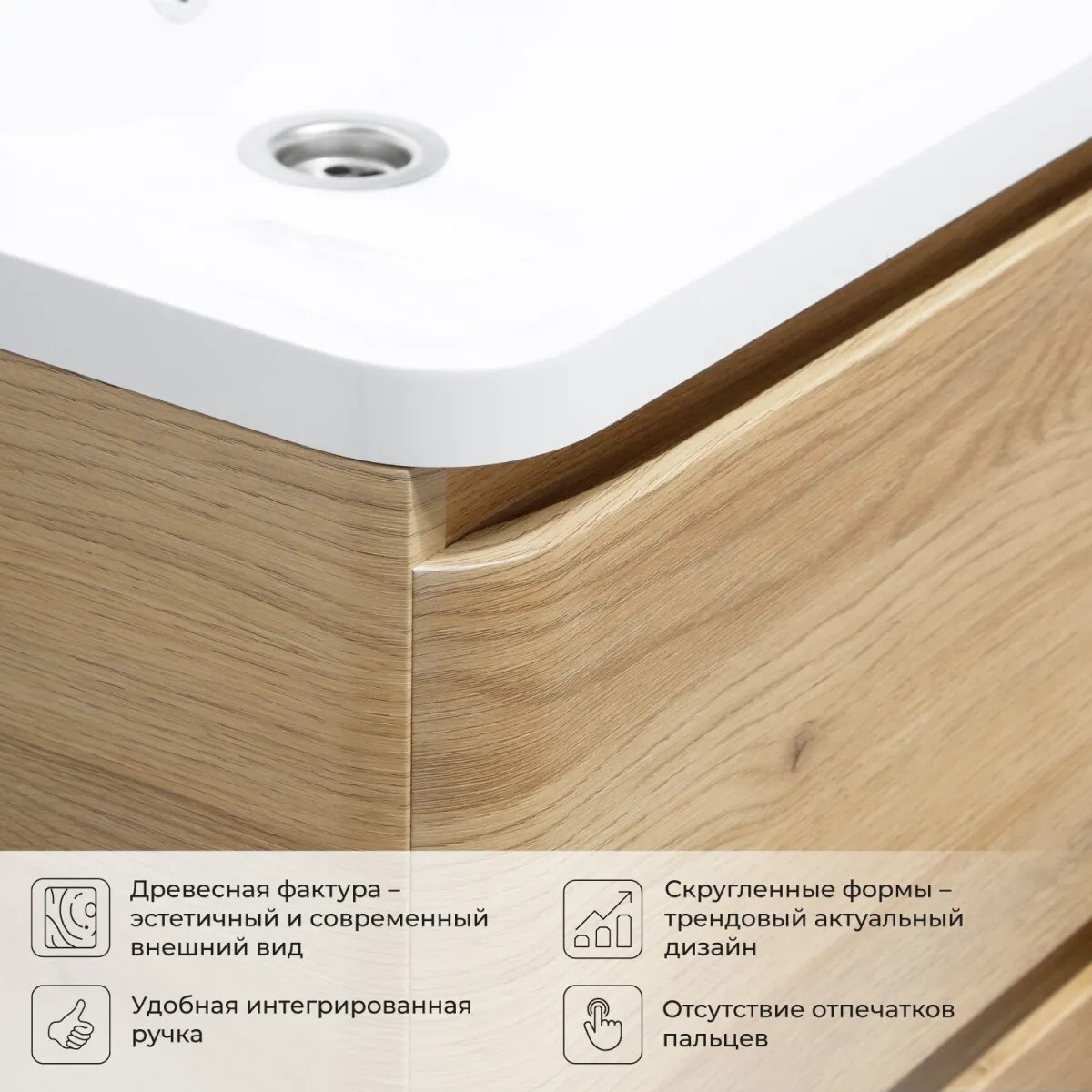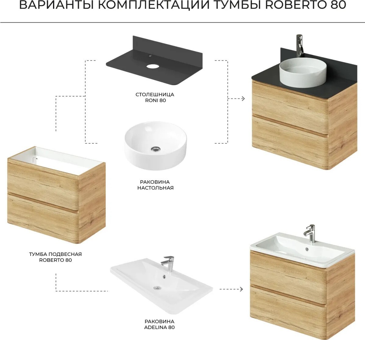 Невероятно органичная по дизайну коллекция Roberto великолепно смотрится в цвете Дуб Мавелла Голд. Качественная фурнитура с доводчиками. Плавное и бесшумное закрывание ящиков. Подвесной способ установки тумбы под раковину дает возможность не только визуально увеличить пространство, но и обеспечивает быстрый и удобный доступ для уборки. Тумба для ванной комнаты способна вместить в себя достаточно много вещей. Изысканность, простота и гармоничность - все сошлось в этой прекрасной коллекции! Модель совместима с раковиной Итана Adelina 80. После покупки требуется самостоятельная сборка.