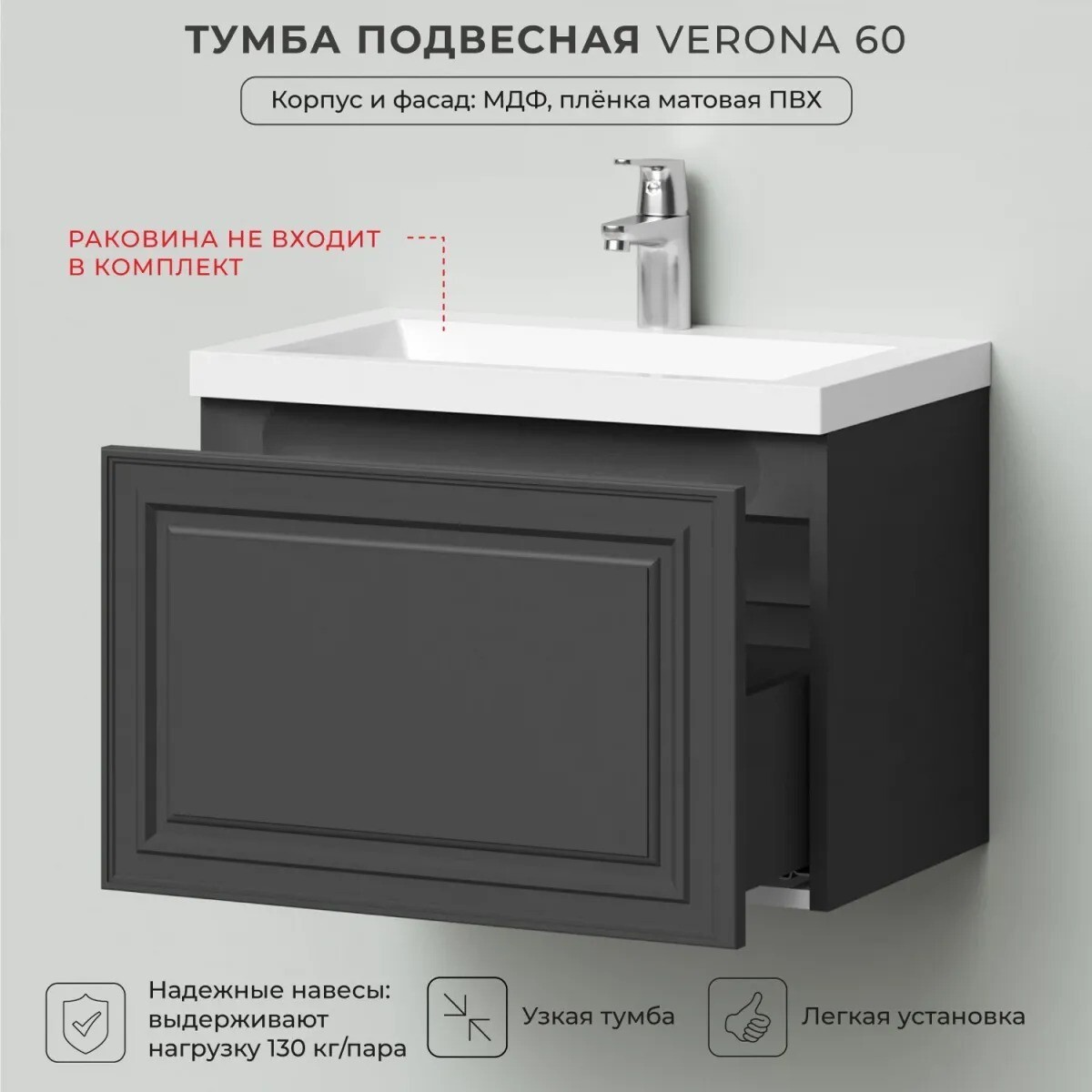 Подвесная тумба под раковину из коллекции Verona станет настоящим украшением ванной комнаты в современном скандинавском стиле. Тумба для ванны изготовлена из прочного МДФ, поэтому выдерживает высокие эксплуатационные нагрузки. Корпус и фасады тумбы для ванной покрыты матовой пленкой, что обеспечивает защиту тумбы под раковину от влаги и перепадов температуры. Качественная фурнитура с доводчиками обеспечивает легкое открывание и плавное закрывание ящиков. Вырез под сифон универсальный, для любого типа. Благодаря своей конструкции тумба обеспечивает удобный доступ к раковине и позволяет скрыть коммуникации. Тумба под раковину в ванную оснащена удобным ящиком для хранения, что позволяет разместить всё необходимое под рукой. Подвесной способ установки дает возможность не только визуально увеличить пространство, но и обеспечивает быстрый и удобный доступ для уборки. Дополнить тумбу можно пеналом и зеркалом. Для точного выбора тумбочки под раковину в ванную комнату рекомендуем обратиться к схеме замеров, которая находится на фото в карточке товара, размеры изделия могут отличаться +/-1 см в связи со спецификой производства. Тумба для ванной доставляется в предварительно собранном виде, надежно упакована.