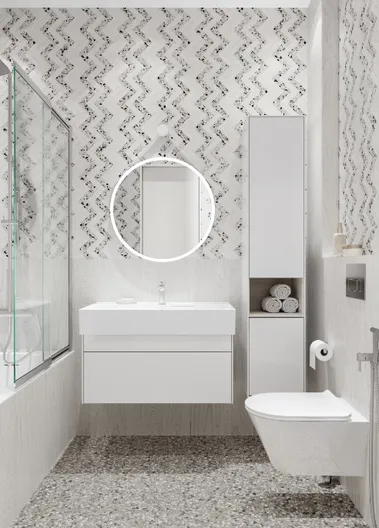 Фасады и корпус выполнены из МДФ в цвете «Белый белоснежный»: верхний фасад — глянцевый, нижний фасад и корпус — матовые. Тумба имеет два выдвижных ящика с открытием Открыть нажатием (Push-to-Open), с внутренней отделкой «Лён Антрацит». Верхний ящик, благодаря нестандартному расположению сифона, содержит больше полезного пространства и удивляет стеклянной вставкой в основании: через такое «окно» снизу струится свет, эффектно подчёркивая содержимое.