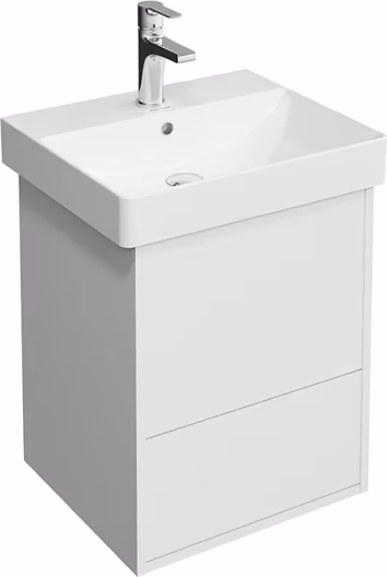 Корпус подвесной тумбы выполнен в белом матовом цвете. В том же цвете решены фасады двух выдвижных ящиков с удобным открыванием Открыть нажатием (Push-to-Open). Тумба предназначена для установки раковины PRO шириной 50 см.