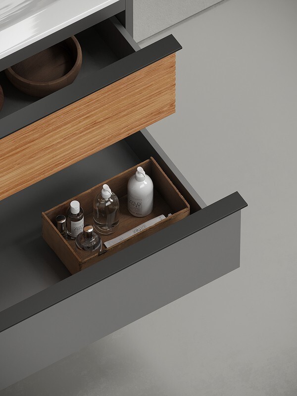 Тумба подвесная Delta c двумя ящиками оснащенными доводчиками скрытого монтажа с системой плавного закрывания и черными профильными накладными ручками. Каркас и фасад тумбы выполнен из мдф, покрытие пвх - пленка в цвете «дуб красный/графит».
