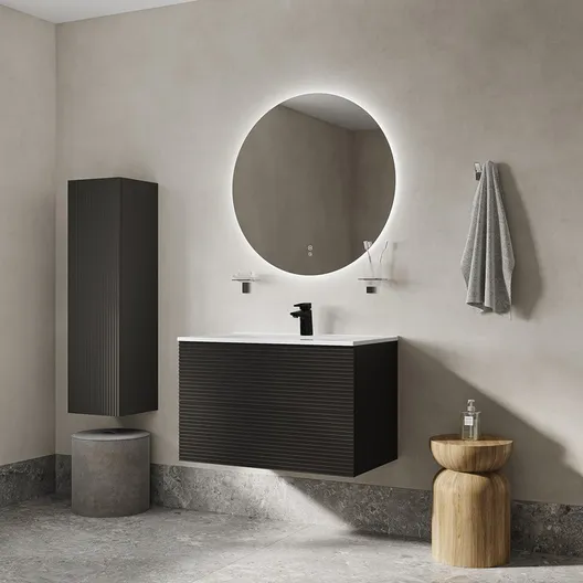 Подвесной пенал для ванной комнаты Bild – красивый дизайн с вертикальной фрезеровкой в сочетании с популярным темно-серым цветом, удобством и практичностью. Универсальная ориентация: пенал можно подвесить так, чтобы дверки открывались в удобную вам сторону (пенал можно перевернуть на 180 градусов, при этом перевешивать дверцы не нужно).