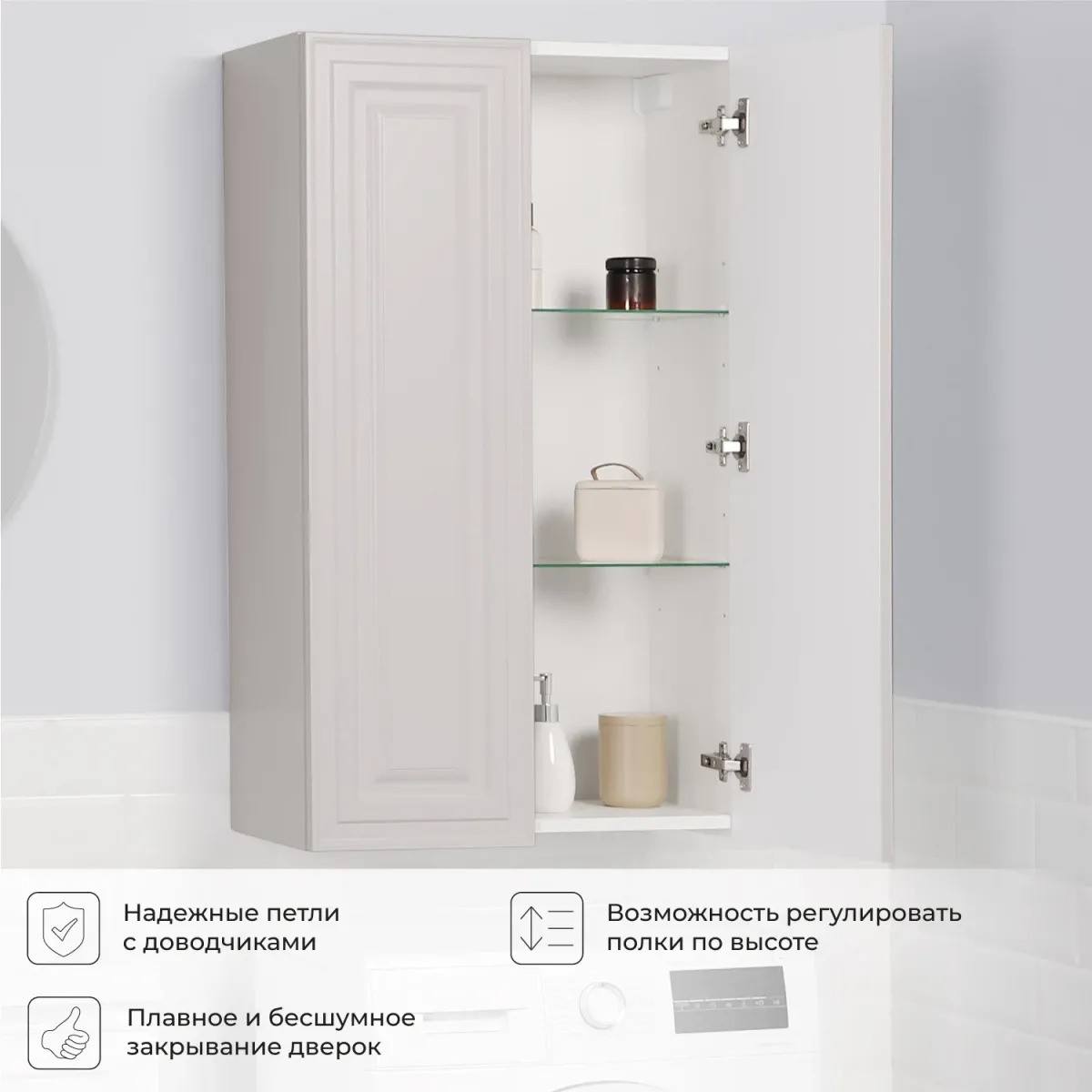Компактный изящный подвесной пенал из коллекции Verona изготовлен из прочного МДФ, поэтому выдерживает высокие эксплуатационные нагрузки. Корпус и фасады покрыты матовой пленкой, что обеспечивает дополнительную защиту мебели от влаги и перепадов температуры. Качественная фурнитура с доводчиками обеспечивает легкое открывание и плавное закрывание дверок. Интегрированные ручки исключают возможность удара о фурнитуру. Коллекция Verona в стиле НЕО-классика включает в себя тумбы и пеналы разных типоразмеров.