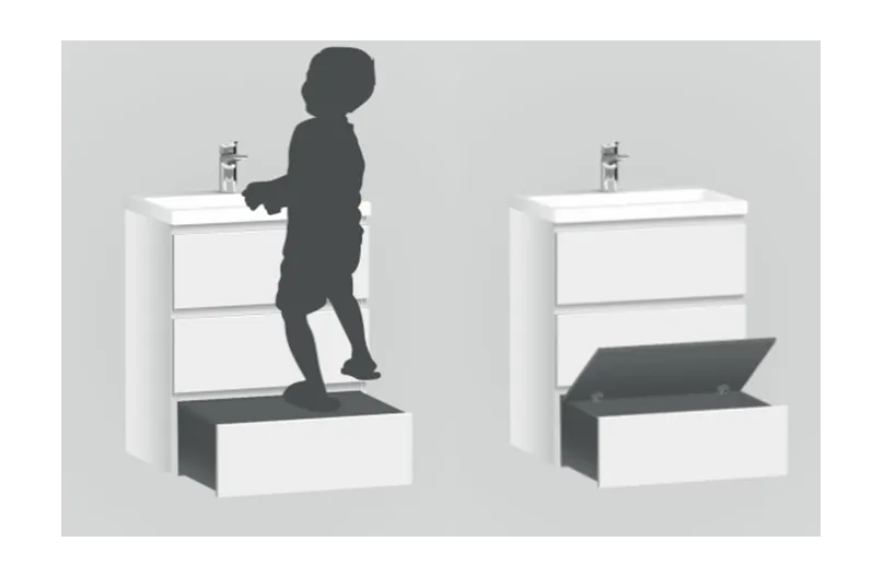 Уникальный нижний ящик базы может быть использован как: выдвижная подставка для детей, для удобного мытья рук (выдерживает нагрузку до 60 кг), дополнительная ниша для хранения (экономия пространства ванной комнаты). Ящики с антискользящим покрытием цвета антрацит – европейский стандарт.