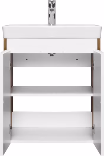 Тумба Сканди Doors 55 выполнена в популярном минималистичном скандинавском стиле. Корпус тумбы выполнен из влагостойкой ЛДСП в декоре натурального дерева, а фасады-створки в белой глянцевой покраске. За створками скрывается вместительное пространство, разделенное на две части регулируемой по высоте полкой из ВЛДСП. На тумбе нет выступающих деталей и фурнитуры, открытие створок реализуется за фасад, верхняя часть которого обработана под ручку J-профиль. К тумбе идеально подходит белоснежная раковина Адриана от бренда Santek. Раковина продается отдельно.