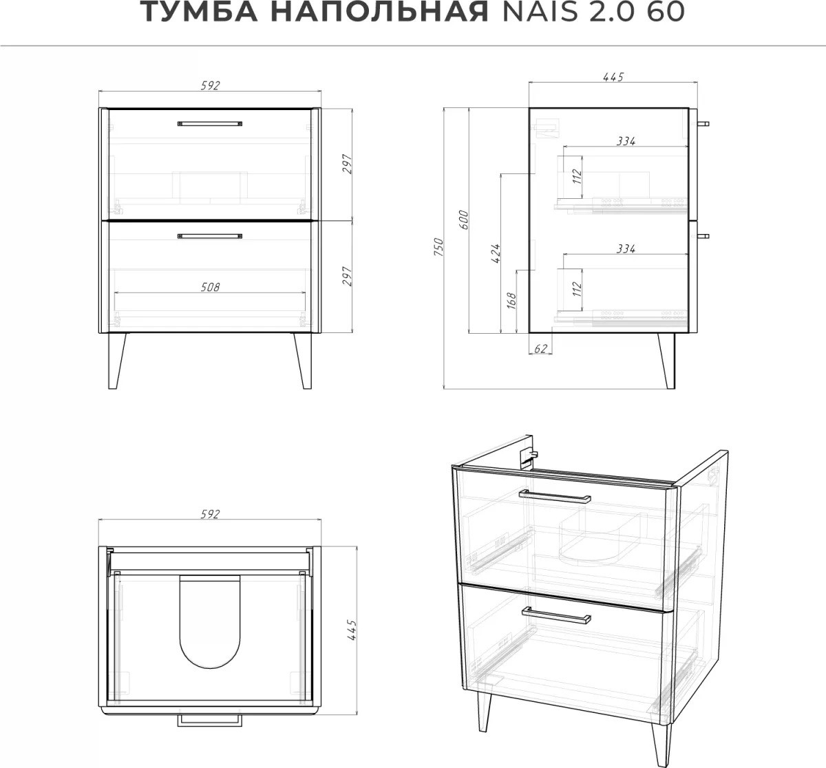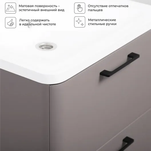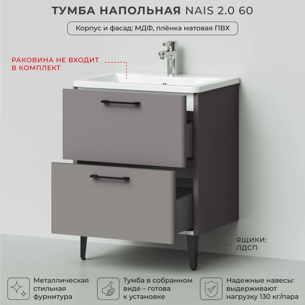 Напольная тумба под раковину из коллекции Nais 2.0 на высоких черных ножках станет настоящим украшением ванной комнаты в современном скандинавском стиле. Изделие изготовлено из прочного МДФ, поэтому выдерживает высокие эксплуатационные нагрузки. Корпус и фасады тумбы для ванной покрыты матовой пленкой, что обеспечивает дополнительную защиту мебели от влаги и перепадов температуры. Качественная фурнитура с доводчиками обеспечивает легкое открывание и плавное закрывание ящиков. Черная матовая ручка уникального дизайна придает изделию богатый, статусный вид.
