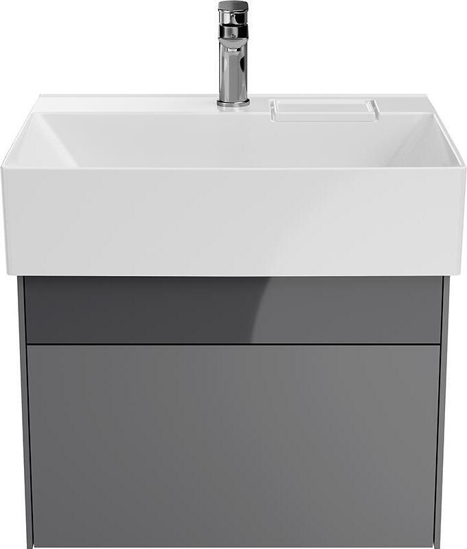 Фасады и корпус выполнены из МДФ в цвете «Стальной серый»: верхний фасад — глянцевый, нижний фасад и корпус — матовые. Тумба имеет два выдвижных ящика с открытием Открыть нажатием (Push-to-Open), с внутренней отделкой «Лён Антрацит». Верхний ящик, благодаря нестандартному расположению сифона, содержит больше полезного пространства и удивляет стеклянной вставкой в основании: через такое «окно» снизу струится свет, эффектно подчёркивая содержимое.