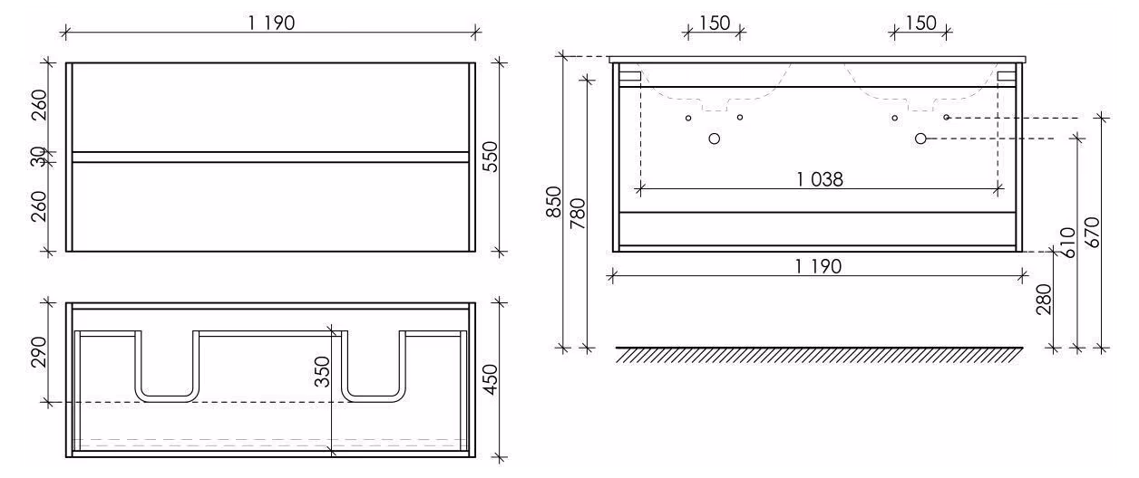 | Тумба подвесная SANCOS Urban 1190х450х550 c двумя ящиками оснащенными доводчиками скрытого монтажа с системой Soft close (плавного закрывания), c ручкой Gola по всей длине тумбы, белый глянец , арт. UR120-2W |