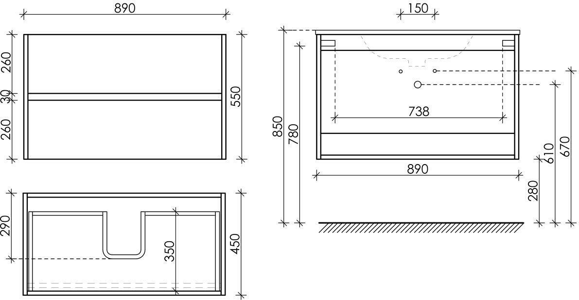 | Тумба подвесная SANCOS Urban 890х450х550 c двумя ящиками оснащенными доводчиками скрытого монтажа с системой Soft close (плавного закрывания), c ручкой Gola по всей длине тумбы, белый глянец , арт. UR90W |