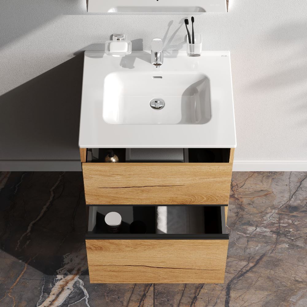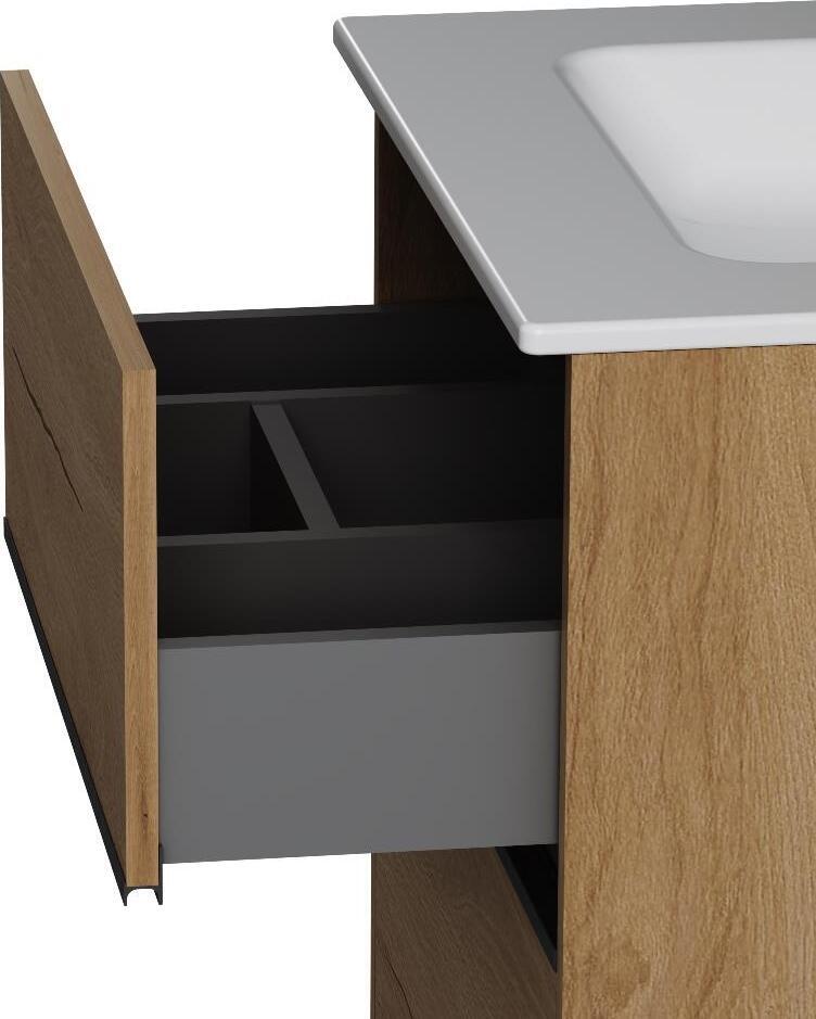 Два вместительных ящика на направляющих Soft-close скрытого монтажа которые обеспечивают плавное и бесшумное открывание и закрывание - использование тумбы максимально комфортное. Элегантная черная акцентная металлическая профильная ручка придает изделию современный и стильный вид подчеркивая его уникальность. Самые популярные цвета: белый глянцевый для создания светлого и воздушного пространства и под натуральное дерево который добавит тепла и уюта в ваш интерьер.