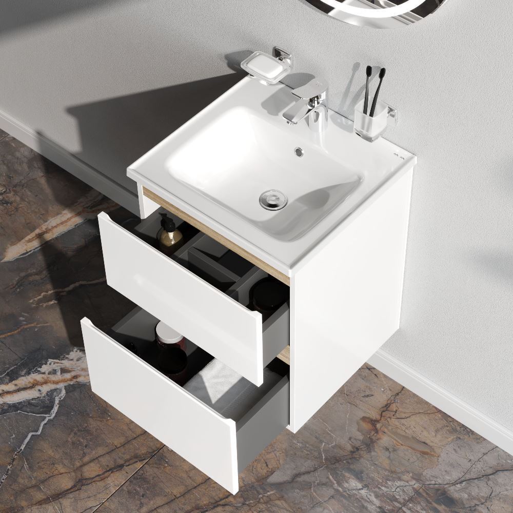 Подвесная тумба помогает сэкономить место в ванной комнате визуально увеличивая пространство. Установка на удобной высоте. Оптимизация хранения вещей внутри ящиков. Грамотно расположенные скрытые коммуникации внутри тумбы. бортик по контуру раковины препятствует проливу воды за мебель. Сантехнический фарфор - долговечный и прочный материал обладающий высокой гигиеничностью.