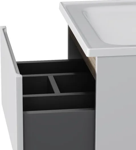 Подвесная тумба бренда AM.PM коллекции X-Joy с белыми глянцевыми фасадами дополненными отделкой под светлое дерево. Функциональный органайзер в первом ящике позволит хранить необходимые косметические средства под рукой и в полном порядке. Внутреннее покрытие каждого ящика выполнено в современном цвете "антрацит" и имеет противоскользящее покрытие. Материал и покрытие корпуса - влагостойкий ЛДСП. Материал фасада - МДФ. Покрытие фасада - высококачественные итальянские краски и эмали.