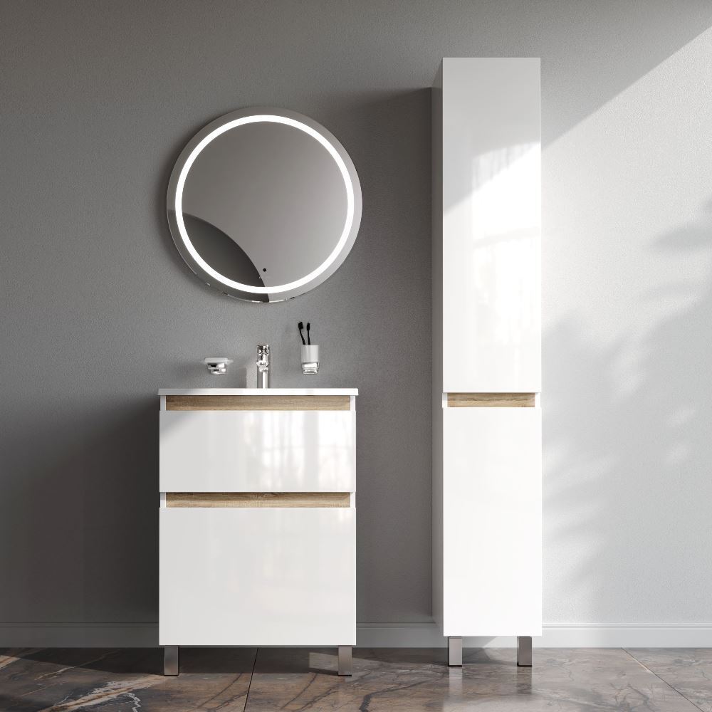 Напольная тумба бренда AM.PM коллекции X-Joy отличается эстетичным сочетанием цветов и фактур от дизайн-агентства Danelon Meroni: белые глянцевые фасады дополнены отделкой под светлое дерево. Функциональный органайзер в первом ящике позволит хранить необходимые косметические средства под рукой и в полном порядке. Внутреннее покрытие каждого ящика выполнено в современном цвете "антрацит" и имеет противоскользящее покрытие. Материал изделия - МДФ ЛДСП. Размер тумбы (Ш/Г/В): 575x445x830. Цвет тумбы - белый глянец.