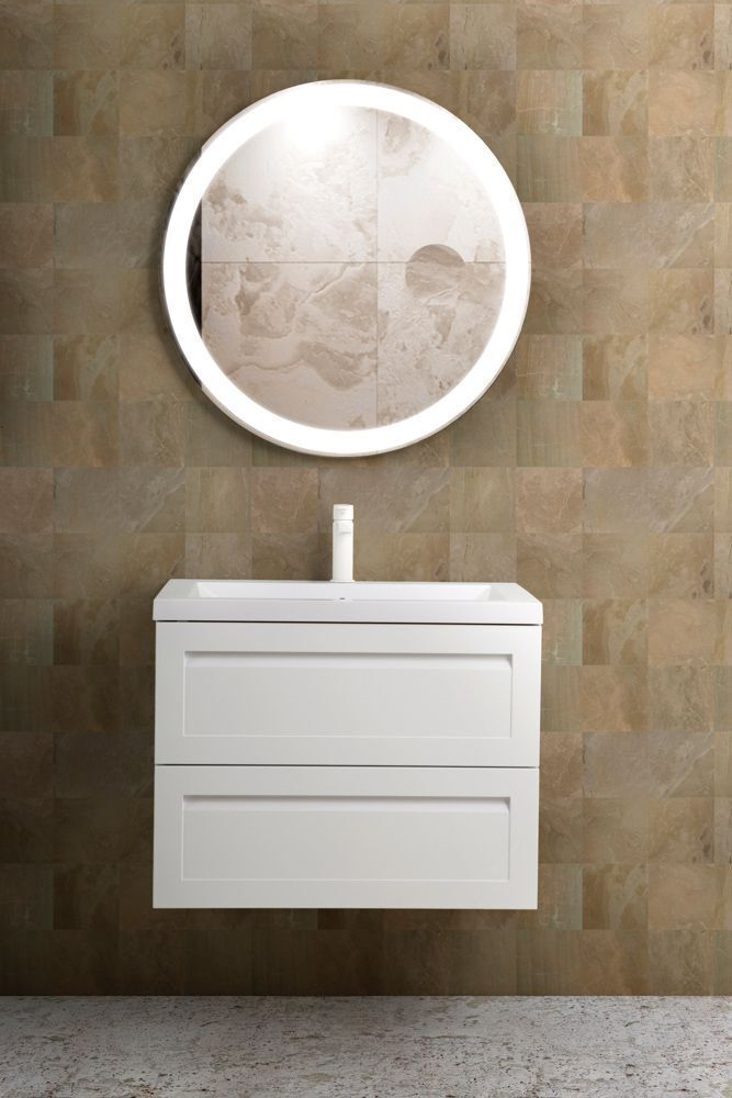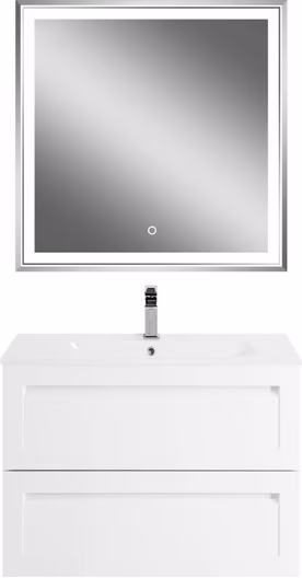 Мебель для ванной комнаты с двумя выдвижными ящиками, комплектуется керамической раковиной . База оснащена доводчиками скрытого монтажа с системой Soft close (плавного закрывания)
