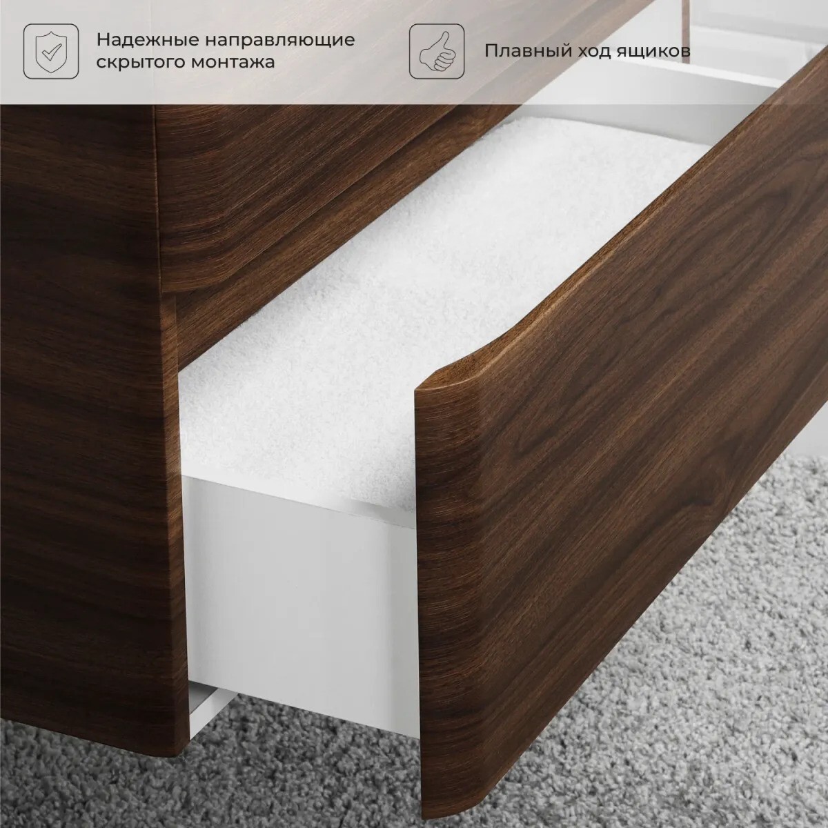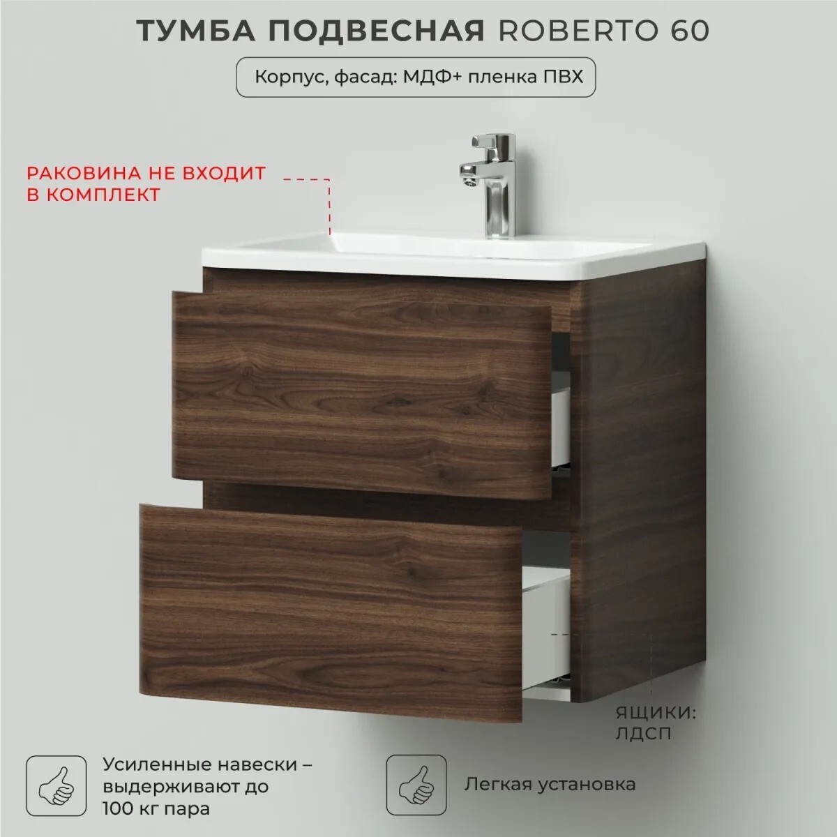 Невероятно органичная по дизайну коллекция Roberto великолепно смотрится в цвете Орех Пекан шоколад стронг. Качественная фурнитура с доводчиками. Плавное и бесшумное закрывание ящиков. Подвесной способ установки тумбы под раковину дает возможность не только визуально увеличить пространство, но и обеспечивает быстрый и удобный доступ для уборки. Тумба для ванной комнаты способна вместить в себя достаточно много вещей. Изысканность, простота и гармоничность - все сошлось в этой прекрасной коллекции! Модель совместима с раковиной Итана Adelina 60. После покупки требуется самостоятельная сборка.