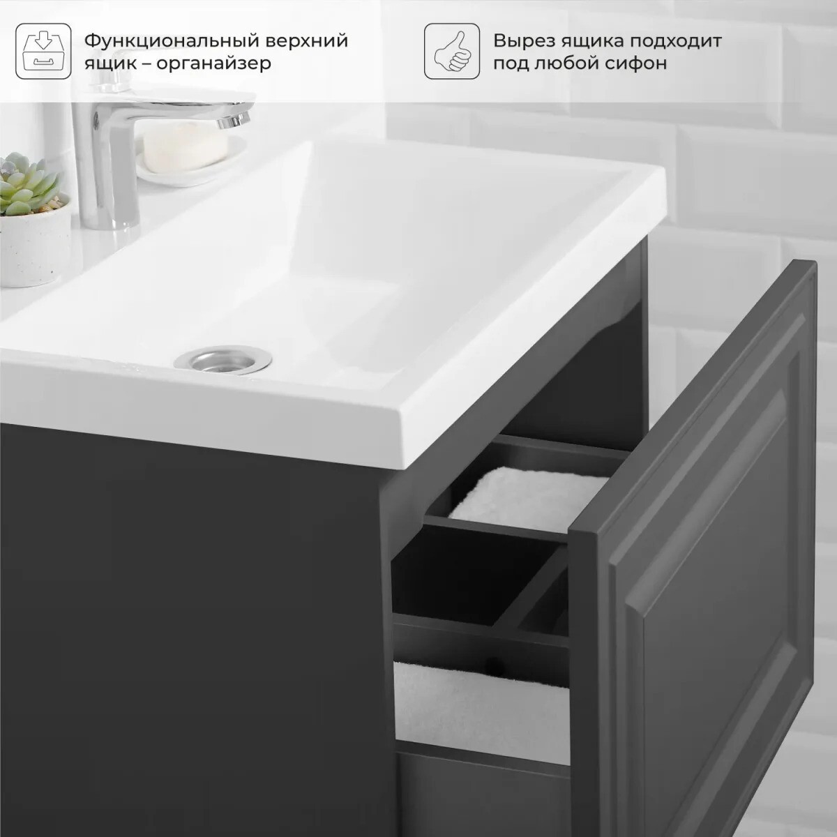 Подвесная тумба под раковину из коллекции Verona станет настоящим украшением ванной комнаты в современном скандинавском стиле. Тумба для ванны изготовлена из прочного МДФ, поэтому выдерживает высокие эксплуатационные нагрузки. Корпус и фасады тумбы для ванной покрыты матовой пленкой, что обеспечивает защиту тумбы под раковину от влаги и перепадов температуры. Качественная фурнитура с доводчиками обеспечивает легкое открывание и плавное закрывание ящиков. Вырез под сифон универсальный, для любого типа. Благодаря своей конструкции тумба обеспечивает удобный доступ к раковине и позволяет скрыть коммуникации. Тумба под раковину в ванную оснащена удобным ящиком для хранения, что позволяет разместить всё необходимое под рукой. Подвесной способ установки дает возможность не только визуально увеличить пространство, но и обеспечивает быстрый и удобный доступ для уборки. Дополнить тумбу можно пеналом и зеркалом. Для точного выбора тумбочки под раковину в ванную комнату рекомендуем обратиться к схеме замеров, которая находится на фото в карточке товара, размеры изделия могут отличаться +/-1 см в связи со спецификой производства. Тумба для ванной доставляется в предварительно собранном виде, надежно упакована.
