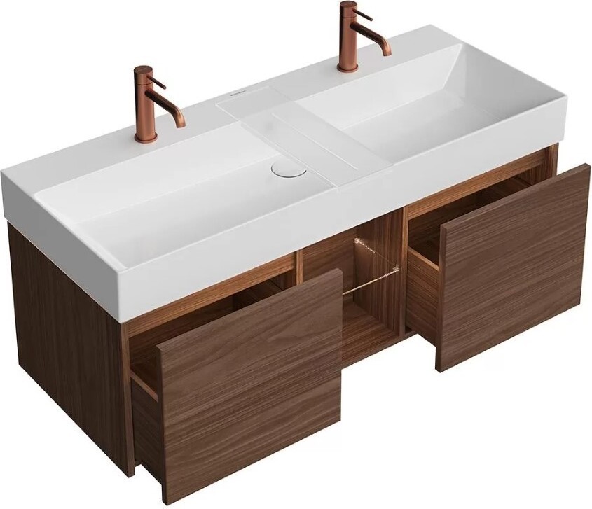 Линейка тумб GRANDE представлена в размере 120 см (габариты 117,8x47x37,3 см). Тумбы в цвете «cтруктурированный орех» предложены в двух вариантах: с тремя ящиками и с двумя ящиками и открытой зоной по центру. Тумбы выполнены из ЛДСП. В тумбах предусмотрено два вида подсветки с сенсорным включением: первая освещает раковину по периметру, вторая установлена между двумя боковыми ящиками и освещает стеклянную полочку из осветлённого стекла. Открытие ящиков реализовано с системой Открыть нажатием (Push-to-Open), простым нажатием на фасад. Внутренняя отделка ящиков – «структурированный орех». Тумба устанавливается только с раковинами GRANDE. В комплектацию входят: гарантийный талон, крепления, инструкция по установке, алюминиевый профиль.