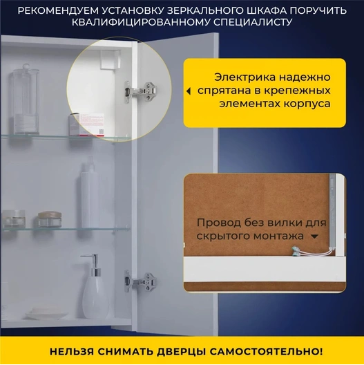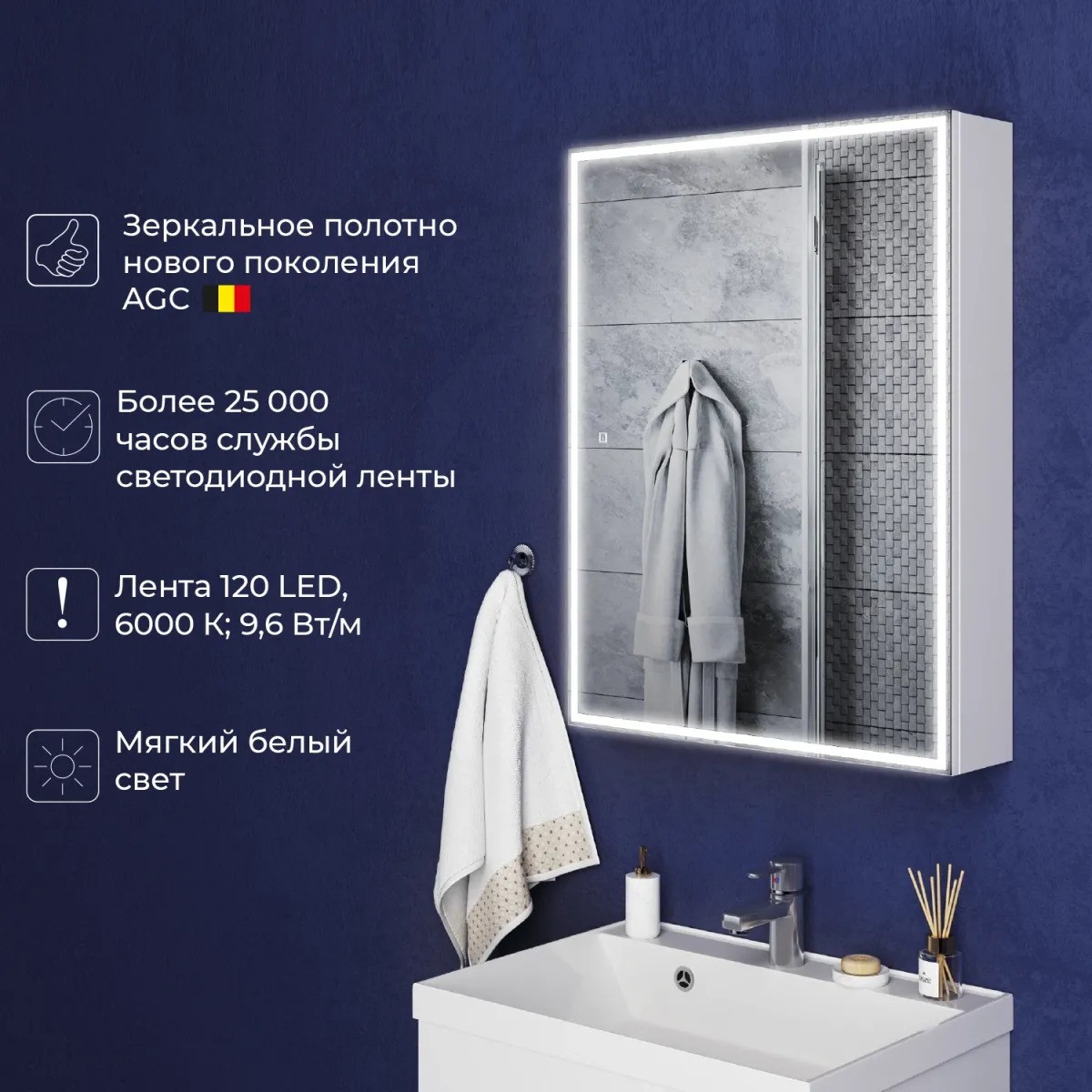 Основное преимущество этого зеркального шкафа с подсветкой в ванную - это его продуманная конструкция. Правостороннее открывание обеспечивает удобный доступ ко всем необходимым вещам, а вместительные полки внутри шкафа позволят хранить все необходимые аксессуары и косметические средства в порядке. Белый цвет шкафа гармонично впишется в любой интерьер ванной комнаты, создавая атмосферу чистоты и уюта.