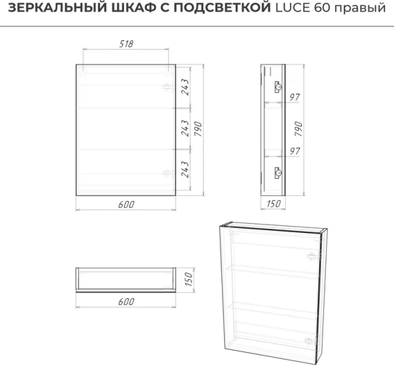 Зеркало-шкаф Itana Luce 60 см, с подсветкой, правое