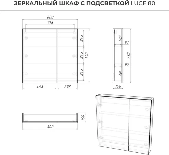 Зеркальный шкаф с подсветкой в ванную имеет оптимальные размеры 800х150х790 мм, которые позволяют удобно разместить его над раковиной. Внутренние полки обеспечивают достаточное пространство для хранения всех необходимых предметов, от косметики до предметов личной гигиены.