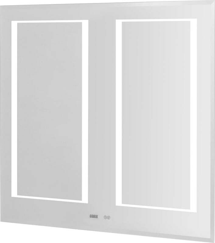 Зеркало оснащено двумя зонами подсветки, системой включения TOUCH посередине, часами, диммером и системой ANTI-STEAM, которая предотвращает запотевание зеркала.