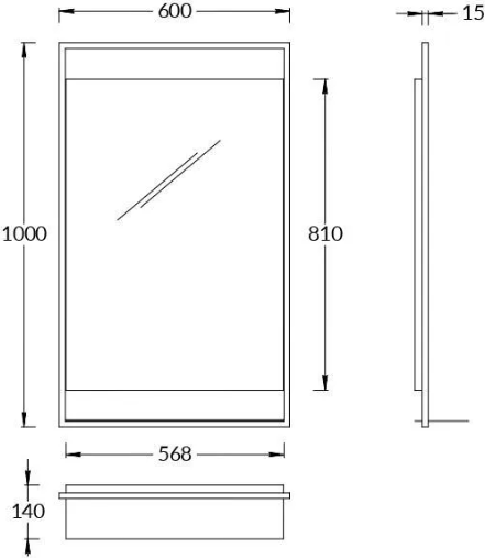 Зеркало с каркасом из металлического профиля с открытой полкой. Вдоль каркаса проведена скрытая LED-подсветка с сенсорным выключателем.