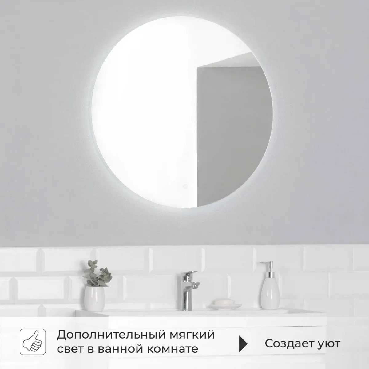 Зеркало с подсветкой в ванную Итана Oreol D 600, круглое зеркало из коллекции Oreol изготовлено из зеркального полотна толщиной 4 мм. Это современная и лаконичная по дизайну модель с удобным сенсорным управлением подсветки. При изготовлении используется светодиодная лента с плотностью диодов 120 шт./м и мощностью 9,6 Вт/м, цветовая температура 6000К (холодный свет) создающая мягкое и равномерное свечение по периметру зеркала. Зеркало для ванной с подсветкой рассчитано на 25 000 часов работы в непрерывном режиме. Все электрические компоненты размещены внутри корпуса. Зеркало с подсветкой настенное может использоваться в помещениях с повышенной влажностью воздуха. В комплекте предусмотрен настенный крепеж. Изделие прошло сертификацию. Гарантия - 2 года.