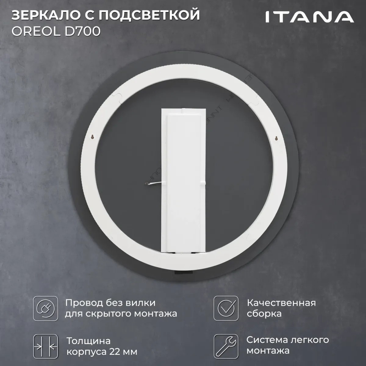 Зеркало с подсветкой в ванную Итана Oreol D 700, круглое зеркало из коллекции Oreol изготовлено из зеркального полотна толщиной 4 мм. Это современная и лаконичная по дизайну модель с удобным сенсорным управлением подсветки. При изготовлении используется светодиодная лента с плотностью диодов 120 шт./м и мощностью 9,6 Вт/м, цветовая температура 6000К (холодный свет) создающая мягкое и равномерное свечение по периметру зеркала. Зеркало для ванной с подсветкой рассчитано на 25 000 часов работы в непрерывном режиме. Все электрические компоненты размещены внутри корпуса. Зеркало с подсветкой настенное может использоваться в помещениях с повышенной влажностью воздуха. В комплекте предусмотрен настенный крепеж. Изделие прошло сертификацию. Гарантия - 2 года.