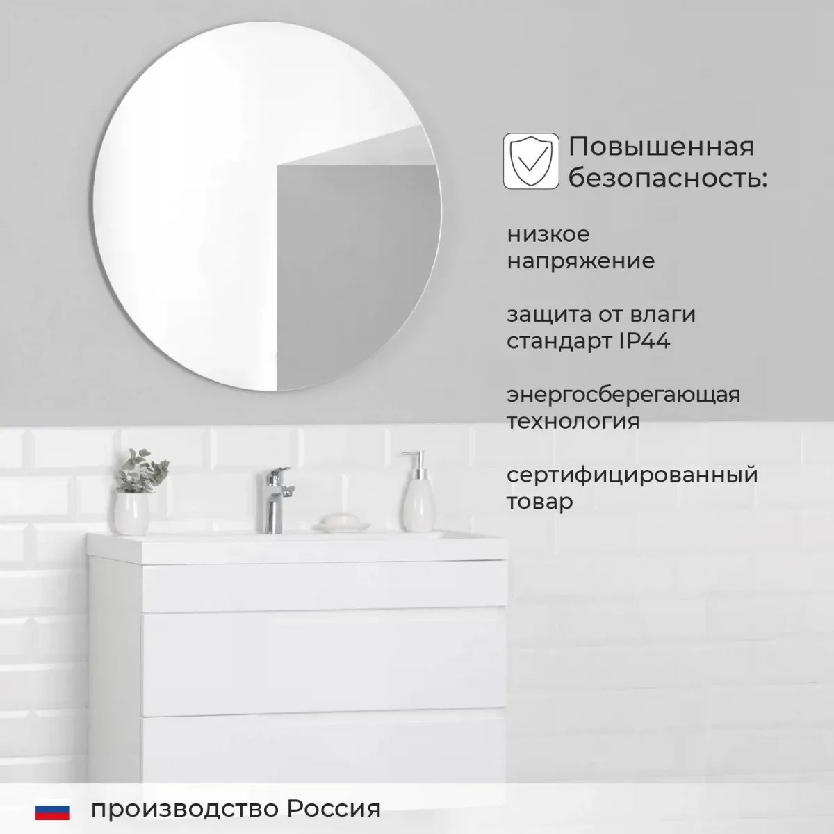 Зеркало с подсветкой в ванную Итана Oreol D 800, круглое зеркало из коллекции Oreol изготовлено из зеркального полотна толщиной 4 мм. Это современная и лаконичная по дизайну модель с удобным сенсорным управлением подсветки. При изготовлении используется светодиодная лента с плотностью диодов 120 шт./м и мощностью 9,6 Вт/м, цветовая температура 6000К (холодный свет) создающая мягкое и равномерное свечение по периметру зеркала. Зеркало для ванной с подсветкой рассчитано на 25 000 часов работы в непрерывном режиме. Все электрические компоненты размещены внутри корпуса. Зеркало с подсветкой настенное может использоваться в помещениях с повышенной влажностью воздуха. В комплекте предусмотрен настенный крепеж. Изделие прошло сертификацию. Гарантия - 2 года.